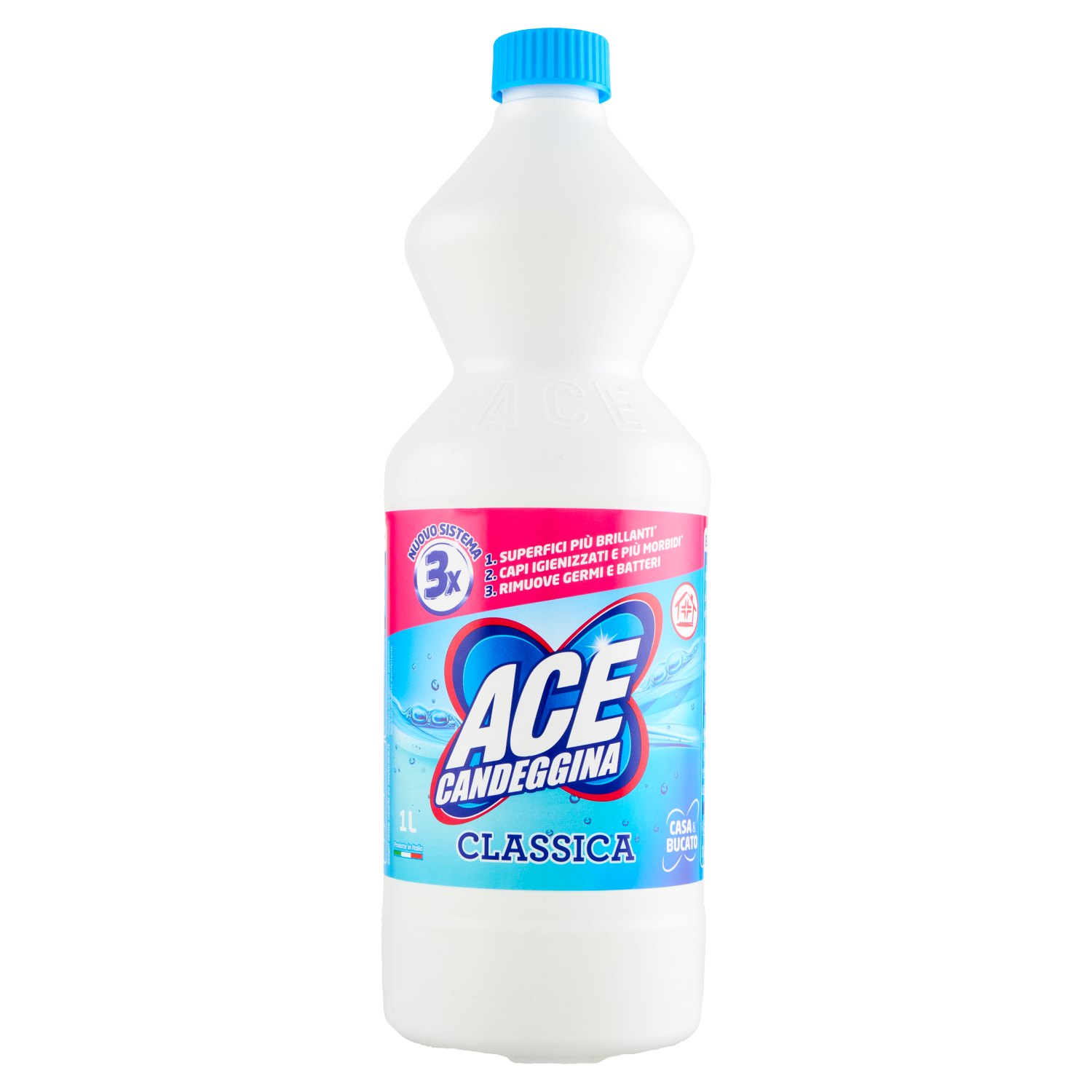 ACE Candeggina Classica è la candeggina n.1 in Italia, ora con il NUOVO SISTEMA 3X, studiato per garantire una pulizia ancora più completa: superfici più brillanti*, capi igienizzati e più morbidi* e rimuove germi e batteri.