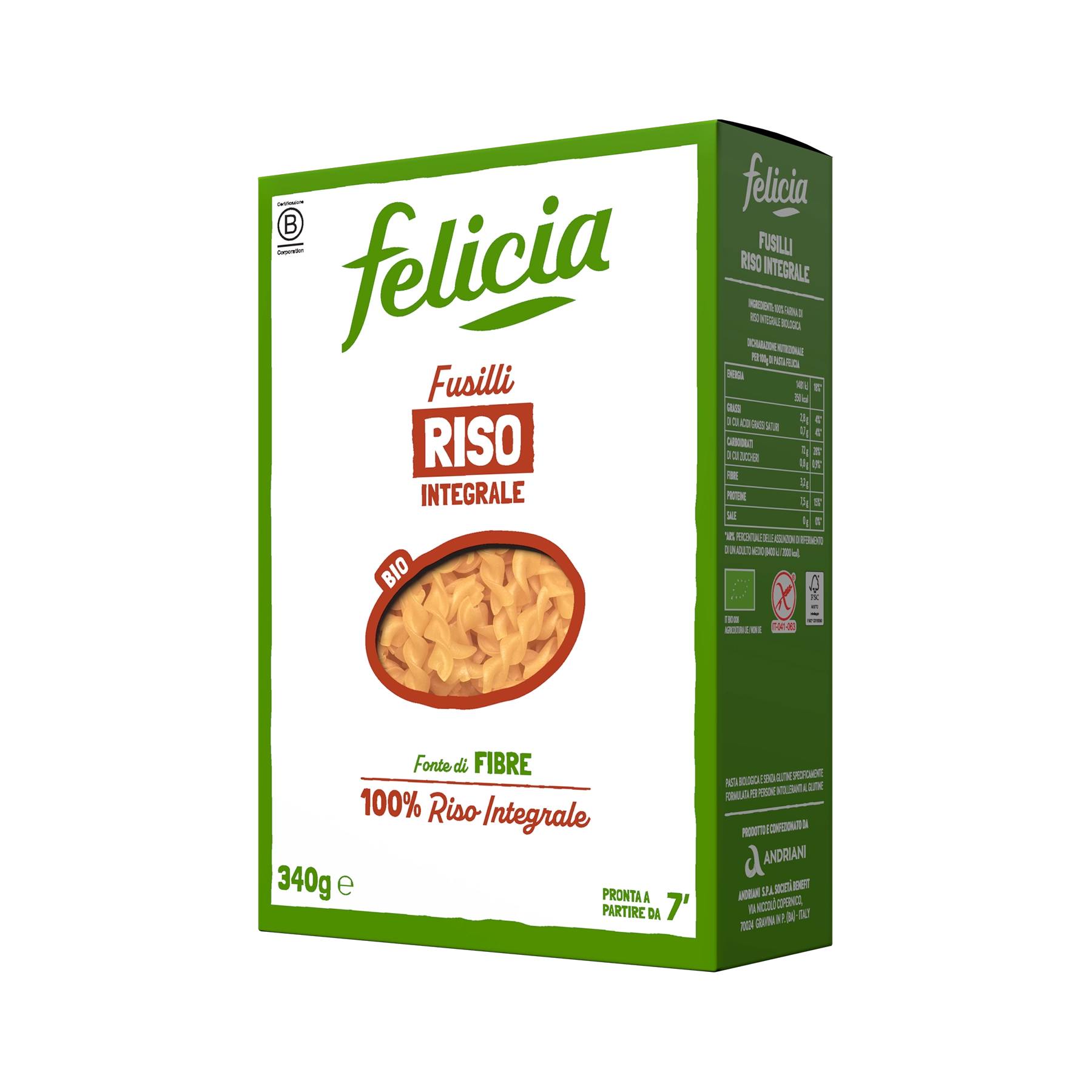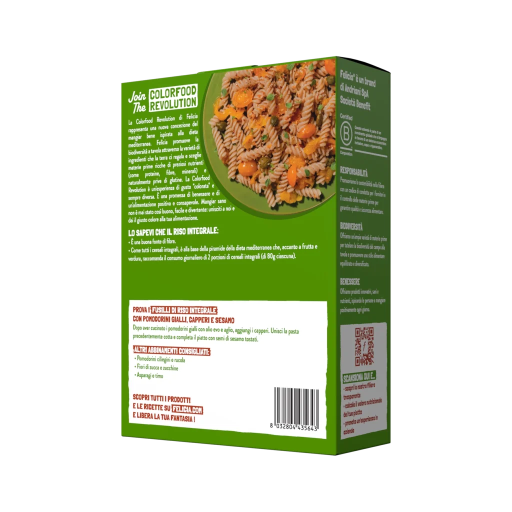 La pasta di riso integrale Felicia è fonte di fibre e ha 1 solo ingrediente: 100% farina di riso integrale bio, naturalmente senza glutine. Il riso integrale, come tutti i cereali integrali, è alla base della piramide della dieta mediterranea che, accanto a frutta e verdura, raccomanda il consumo giornaliero di 2 porzioni di cereali integrali (di 80g ciascuna).