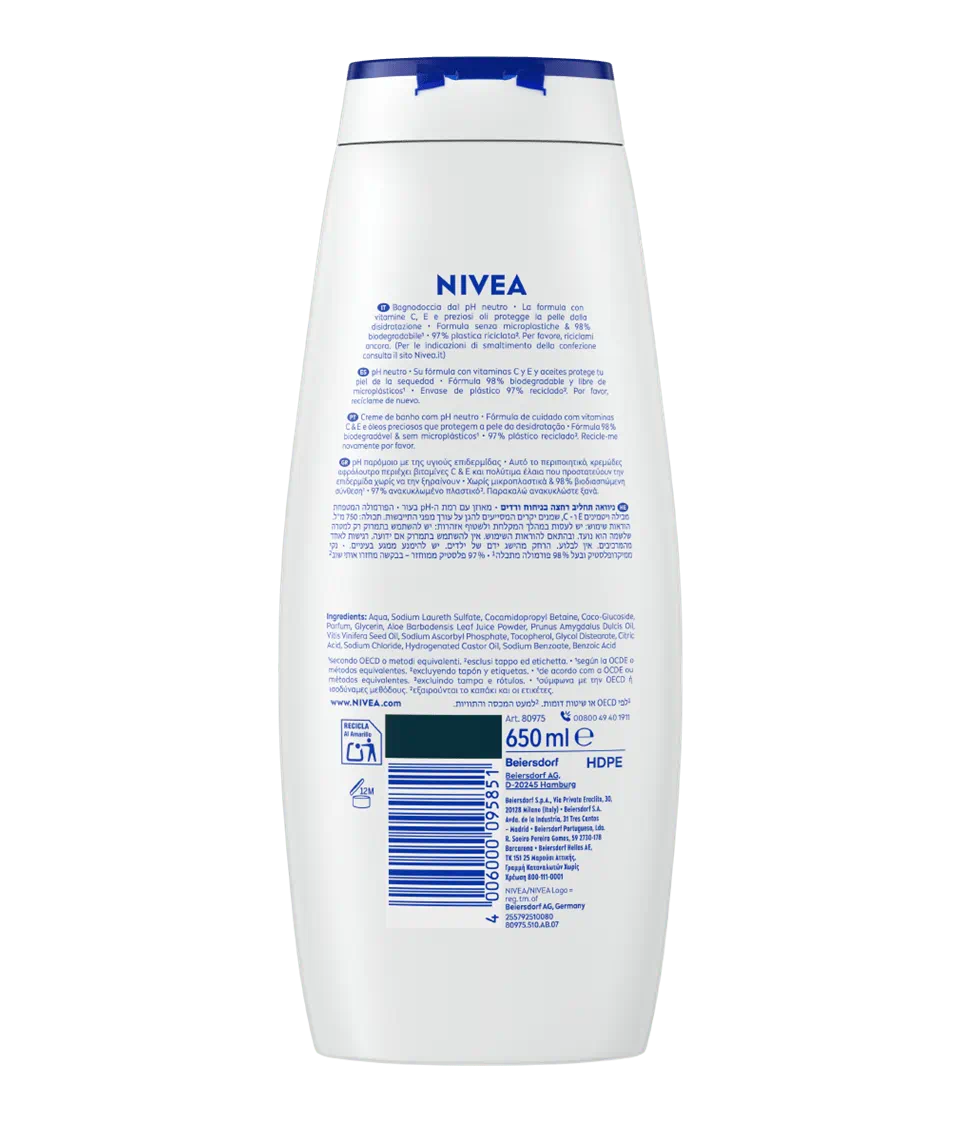 Bagnodoccia NIVEA Creme Aloe lascia la pelle incredibilmente morbida e liscia. Arricchito con vitamine C ed E e oli naturali, mantiene la pelle idratata per tutto il giorno. Lasciati avvolgere dal rinfrescante profumo di Aloe per un'esperienza di puro benessere