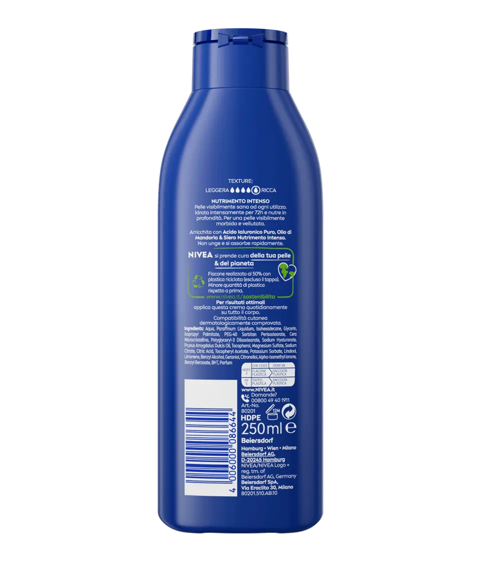 NIVEA Crema Corpo Nutriente ora con Acido Ialuronico 100% puro, Olio di Mandorla e Siero Nutrimento Intenso, idrata intensamente e nutre in profondità.